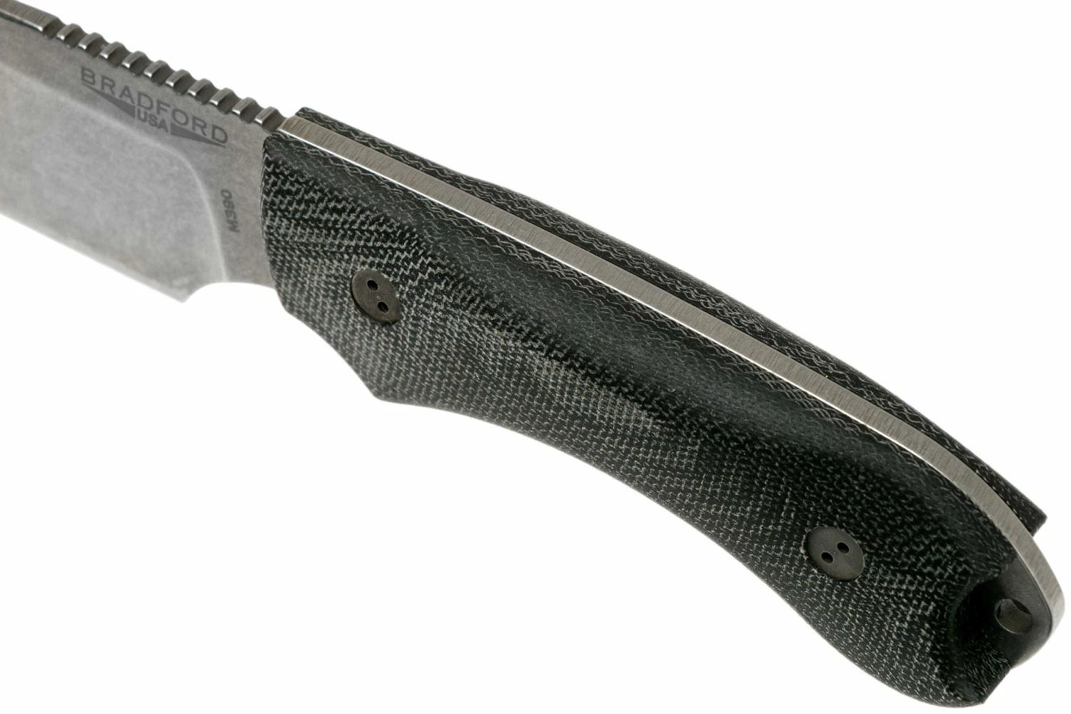 El Bradford Guardian 4 es un buen cuchillo fijo para tareas de exterior. Desde la caza y el senderismo hasta la caza y la supervivencia. Tiene una hoja de 11,8 cm y debido a la gran ranura para los dedos, justo detrás del extremo, tienes mucho control sobre la hoja. La hoja está hecha de acero Böhler M390. Se trata de un tipo de superacero austriaco. Una de las mejores opciones de gama alta del momento. El M390 destaca en cuanto a la retención del afilado y la resistencia a la corrosión. El mango está hecho de micarta, Un material compuesto de lino y resina sintética. Este Bradford Guardian 4 viene en una funda de cuero. Está reforzado con una trabilla para el cinturón.