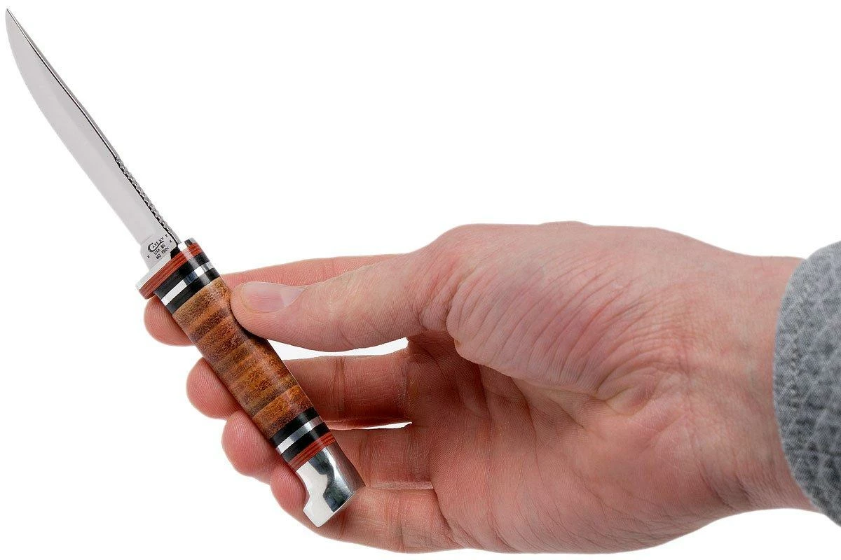 El Case Leather Hunter es un pequeño cuchillo fijo diseñado para la caza. Debido a la longitud limitada de su hoja y a su punta puntiaguda, es perfecto para destripar la caza. En el extremo del mango se encuentra un hermoso pomo de aluminio.