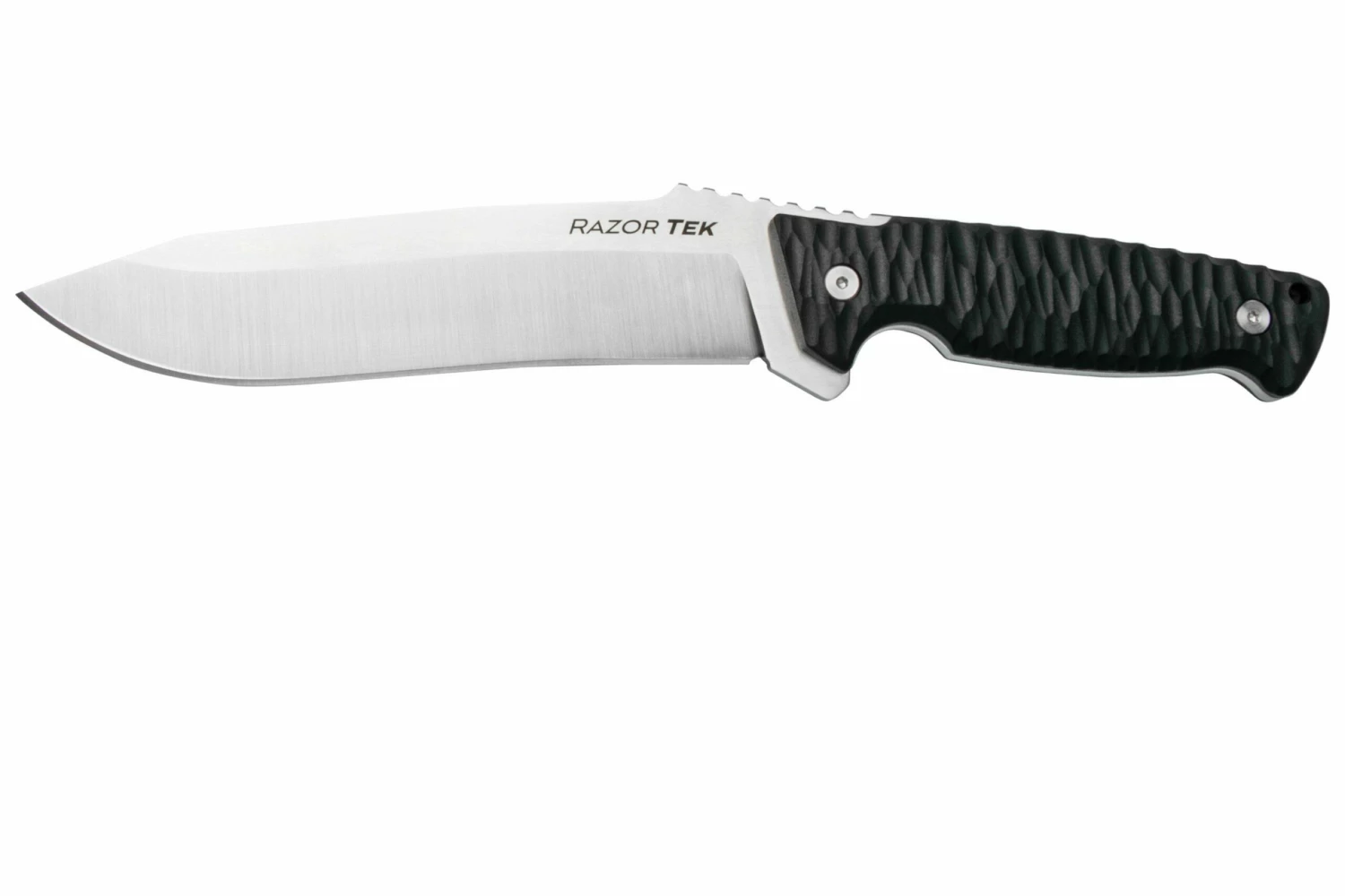 El Cold Steel Razor Tek es un cuchillo de gran tamaño, perfecto para las tareas más exigentes en el campamento. El mango ergonómico se siente muy bien en la mano y el protector de dedos asegura que no te resbales y termines en la hoja. La hoja de colmillo completo está hecha de acero inoxidable 4116. Un tipo de acero sencillo y sin complicaciones que es fácil de afilar. El cuchillo Razor Tek viene con una funda Secure-Ex con trabilla para el cinturón.