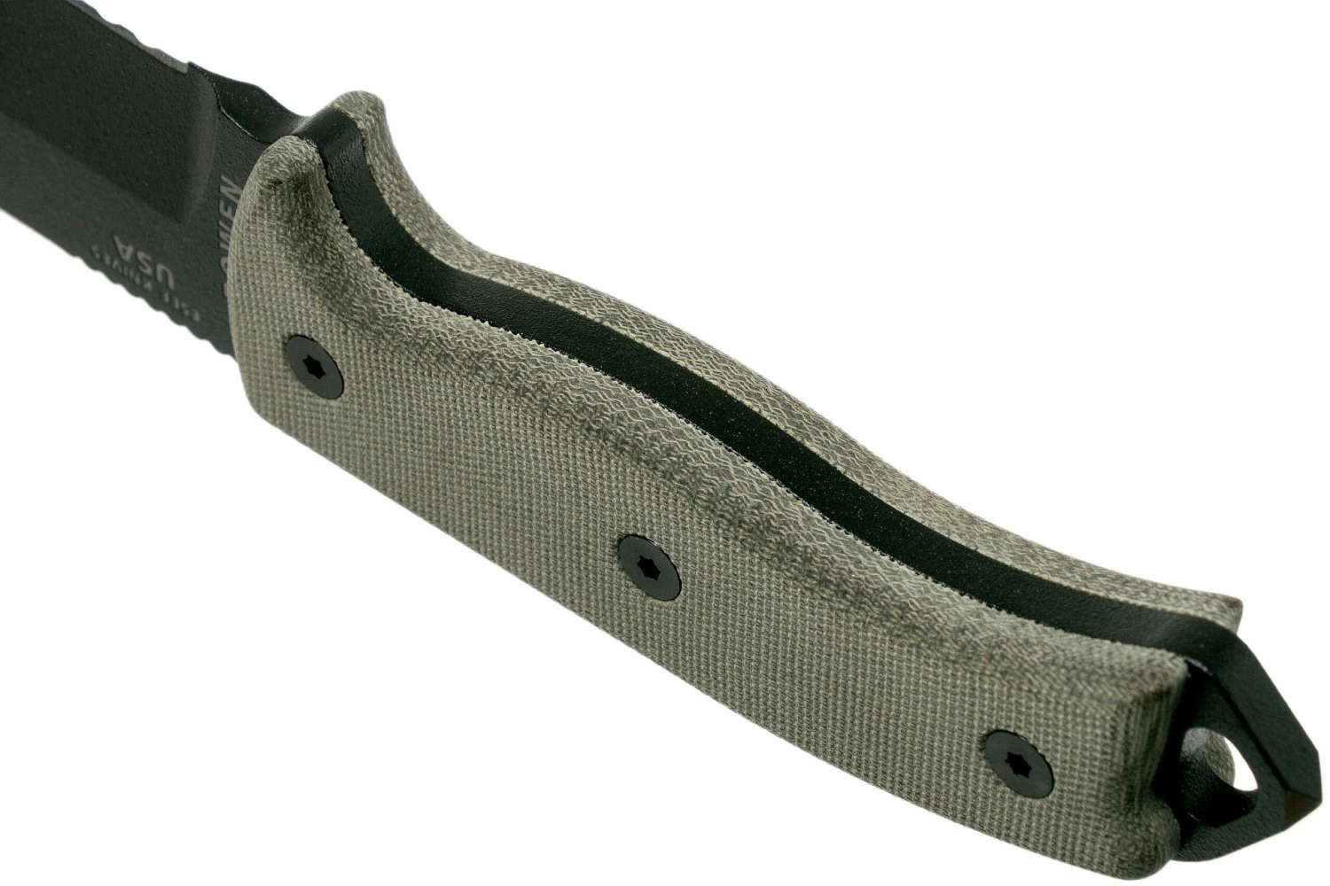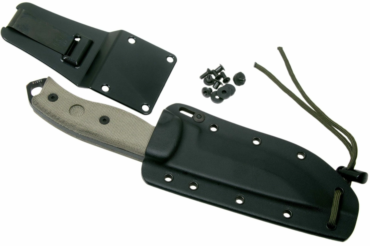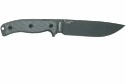 El ESEE Model 5 es un sólido cuchillo de supervivencia con una hoja hecha de acero al carbono 1095. El revestimiento en polvo extremadamente sostenible de la hoja la protege de la sensibilidad a la corrosión del acero carbono. Las maravillosas cualidades de uso del acero garantizan una vida de satisfacción. La hoja full-tang se ha mejorado con un mango de micarta. Este mango se siente un poco rugoso, lo que es estupendo para el agarre y la comodidad. El ESEE Model 5 es un cuchillo grande y sólido que puede aguantar un uso extremadamente intenso. Si su tamaño y peso te parecen demasiado, el Model 4 o el Model 3 son excelentes alternativas más pequeñas.