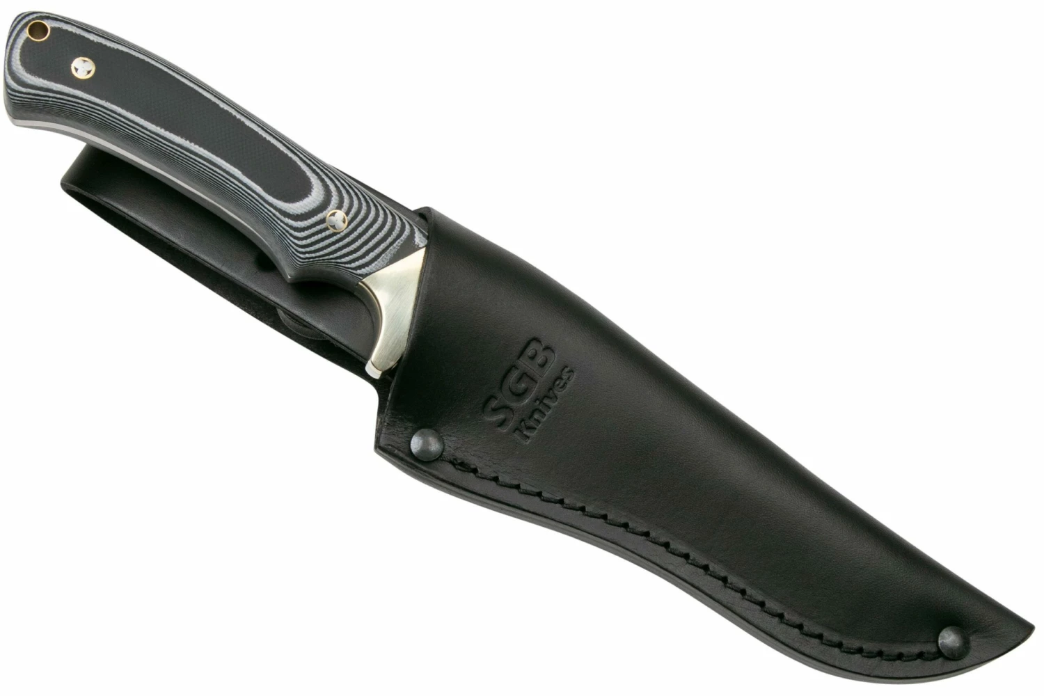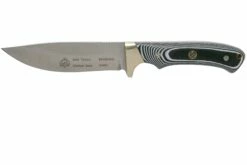 El PUMA SGB Teton es un moderno cuchillo de caza. El mango de este cuchillo de caza está hecho de G10 negro, un material resistente que se adapta cómodamente a la mano. La ranura para los dedos proporciona un buen agarre del cuchillo. Las cachas se mantienen unidas por 2 hermosos remaches de mosaico. Un hermoso escudo con el logotipo de PUMA SGB está colocado en el mango. La hoja de punta caída está hecha de acero 1.4116, un acero alemán que conserva bien su filo y es fácil de afilar. El mango y la hoja están separados por un robusto cabezal de latón. Esto también funciona como un protector de dedos, por lo que tus dedos están seguros incluso durante las tareas de corte más pesadas.