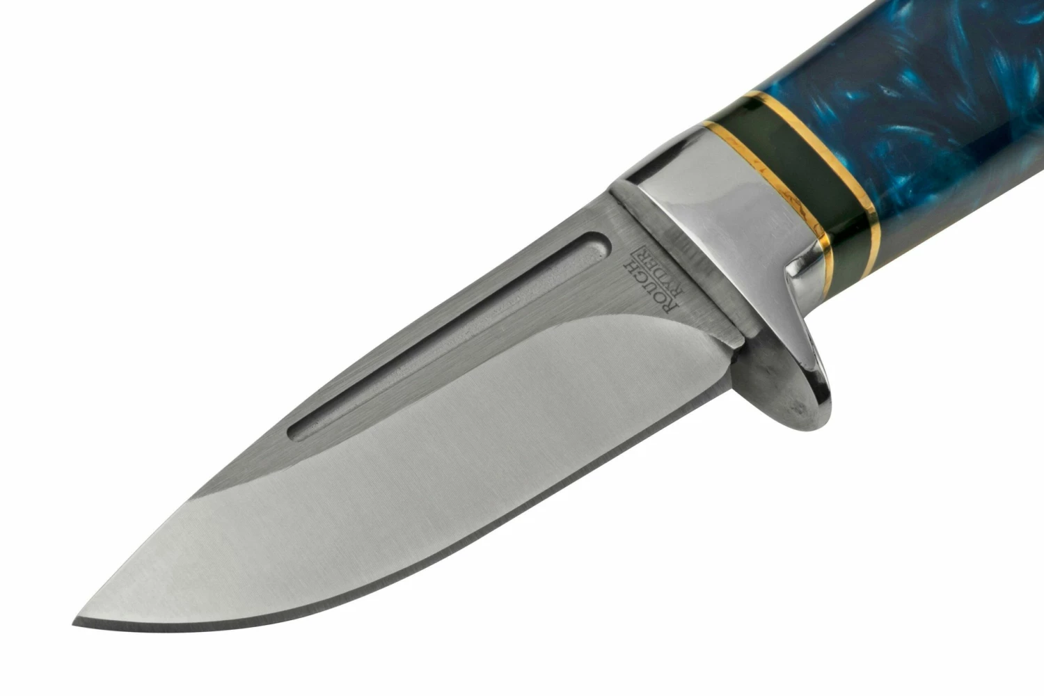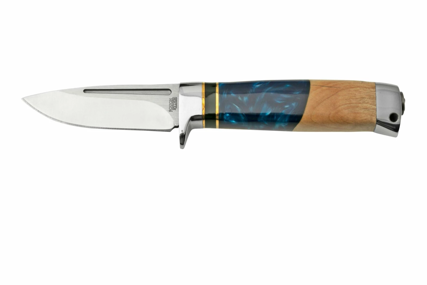 El Rough Ryder Fixed Blade es un cuchillo fijo genial. Un gran cuchillo de caza. Al ver este cuchillo, te darás cuenta inmediatamente del mango. Fabricado en madera y resina, la combinación de colores es lo que hace que este cuchillo sea único. El cuchillo viene con una pequeña piedra de afilar y una bonita funda de nylon.