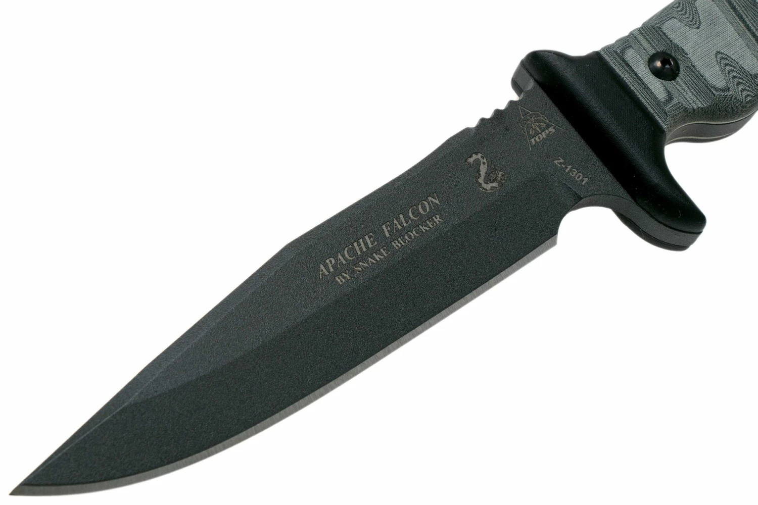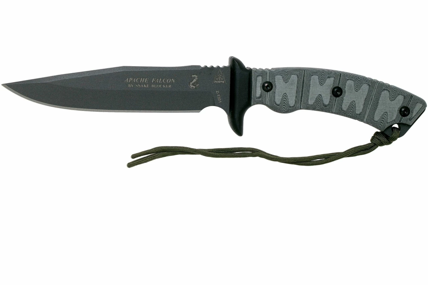 El TOPS Knives Apache Falcon AFAL-01 es un sólido cuchillo de supervivencia, diseñado por Snake Blocker. Es un experto en las artes marciales de los apaches lipanes. En Estados Unidos es conocido por su aparición en muchos programas de televisión. Aplicó con éxito sus experiencias a este diseño. El Apache Falcon es un cuchillo fijo sólido como una roca, sobre todo por el impresionante grosor de su hoja: 6,4 mm.