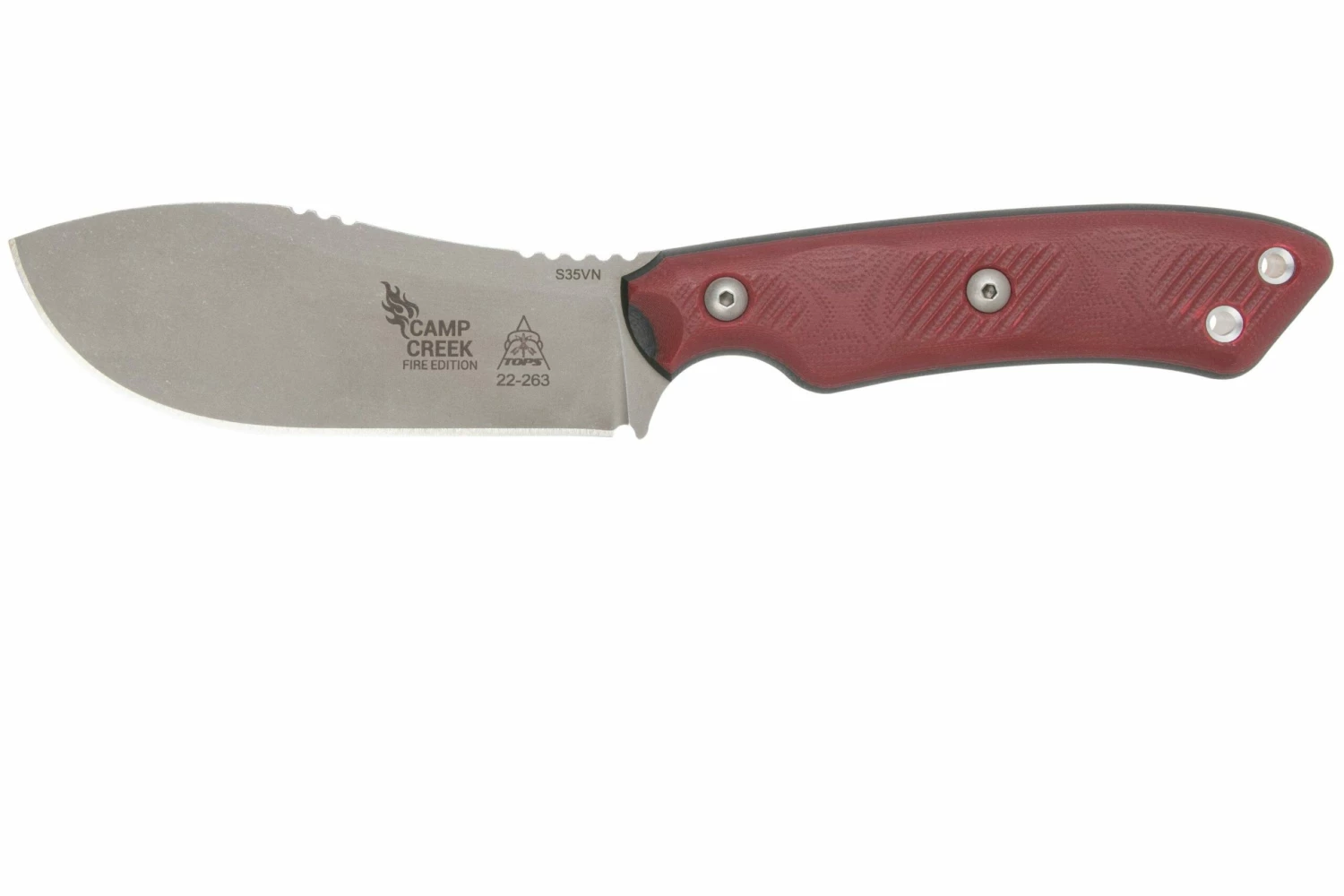 El TOPS Knives Camp Creek Fire Edition es un notable cuchillo de caza que también puede utilizarse como cuchillo de acampada. Todos los años, el director de TOPS, Leo Espinoza, fabrica un cuchillo para la temporada de caza. Estos diseños se incluyen regularmente en la colección permanente de TOPS Knives. Este TOPS Knives Camp Creek Fire Edition es uno de esos cuchillos.