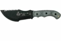 TOPS Knives Tom Brown Tracker es un cuchillo de supervivencia especialmente versátil. El impresionante ancho de la hoja de 7,5 mm garantiza que este cuchillo aguante todo. El lomo del cuchillo está dentado para poder serrar con él. El primer dentado es algo más profundo que los demás, lo que te permite, por ejemplo, cortar una valla de alambre. La nueva curvatura en el centro del filo lo hace adecuado para tallar madera, o para limpiar la caza abatida. La forma general de la hoja la hace estupenda para trabajos menos pesados. La hoja de acero carbono 1095 es muy afilada y tiene un Traction Coating negro para protegerlo de la corrosión y evitar que refleje. El agarre de micarta tiene una línea blanca sutil. Micarta ofrece mucho agarre aunque tengas las manos mojadas o se usen guantes.