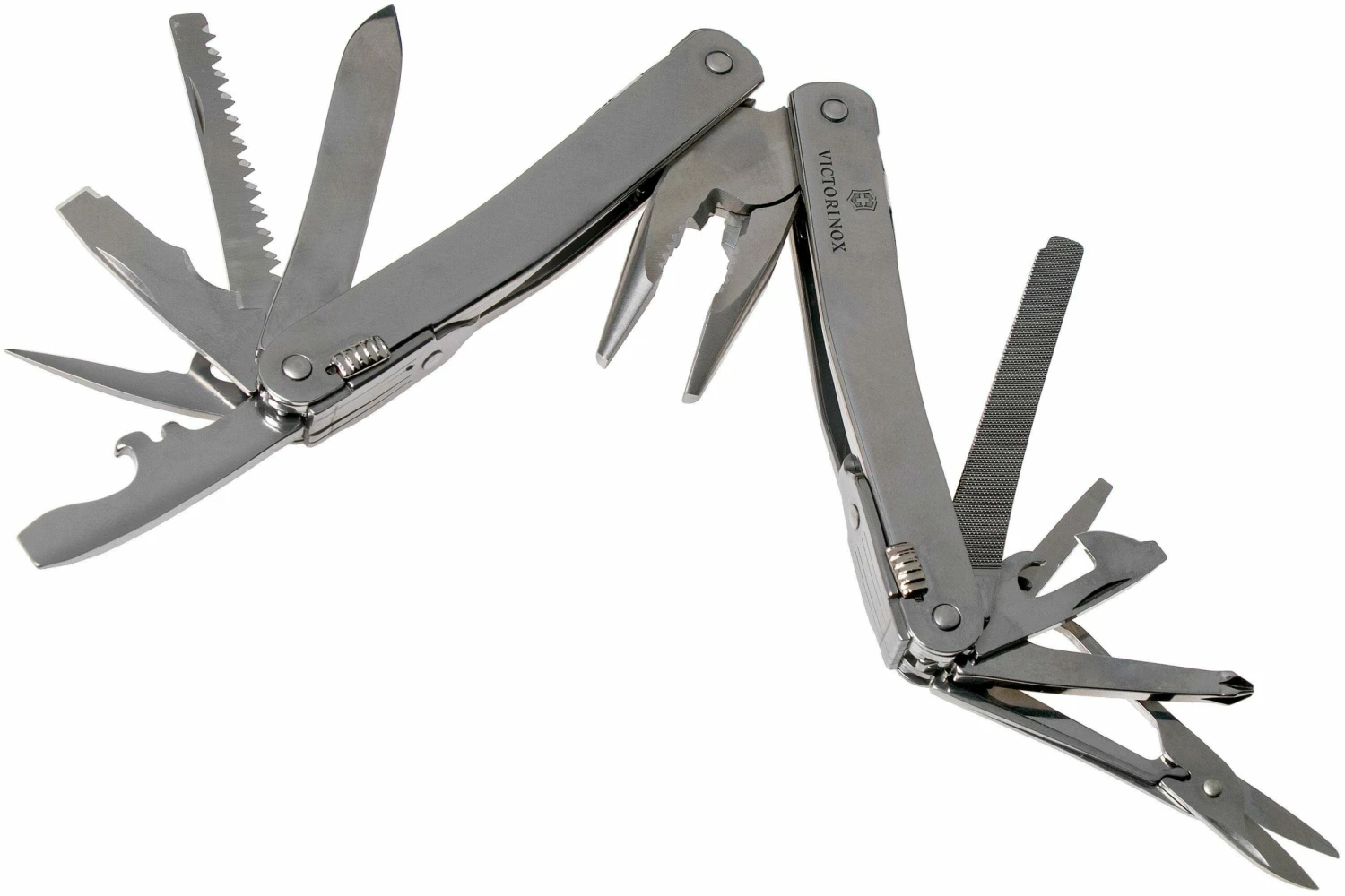 | Herramientas | portabrocas, abridor de botellas, cincel, sacacorchos, lima, gancho multiusos, llavero, cuchillo, sierra, tijeras, destornillador, destornillador pequeño, abrelatas, cortacables, pinzas de punta, destornillador de estrella, dobladora de alambre |